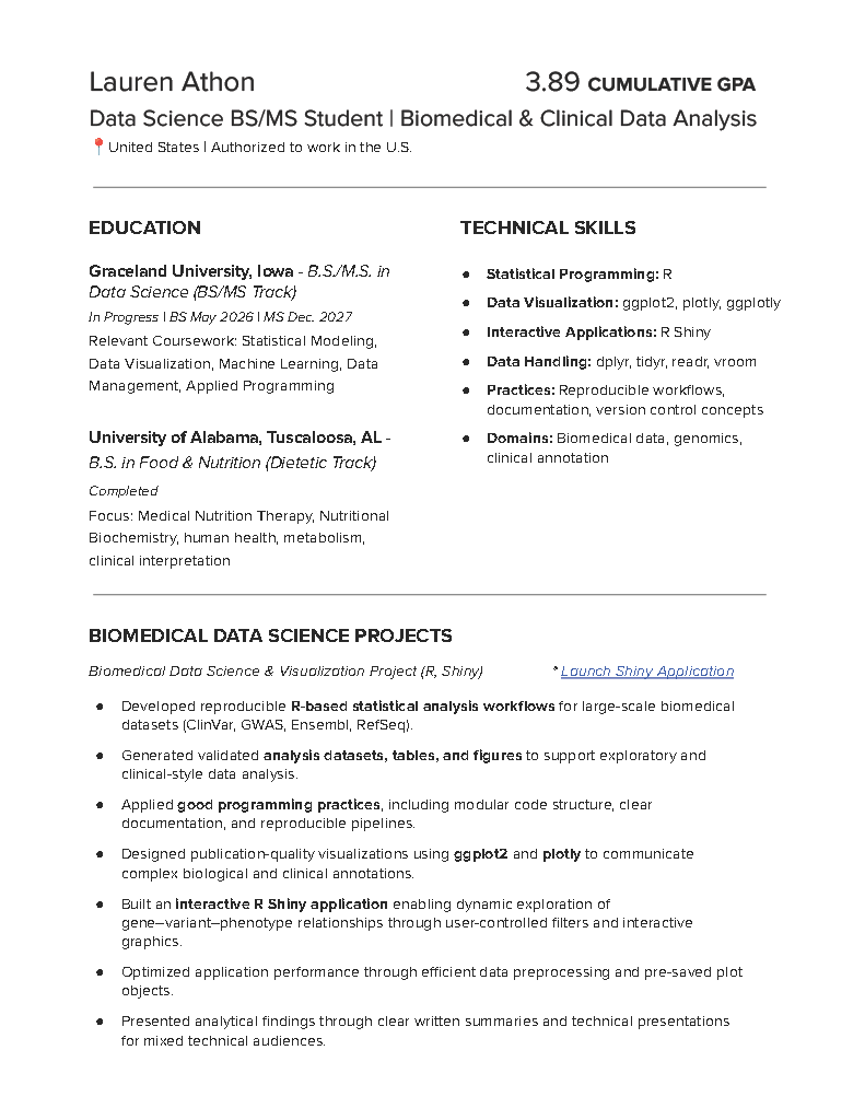 My academic and project work emphasizes reproducible workflows, thoughtful data preprocessing, and clear communication of complex biological and clinical information. I am particularly interested in how data science can support patient-centered research within regulated clinical and biomedical environments.
